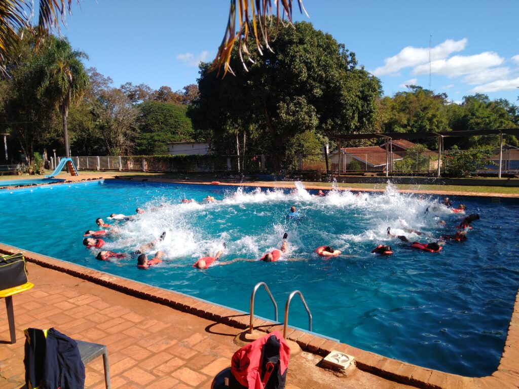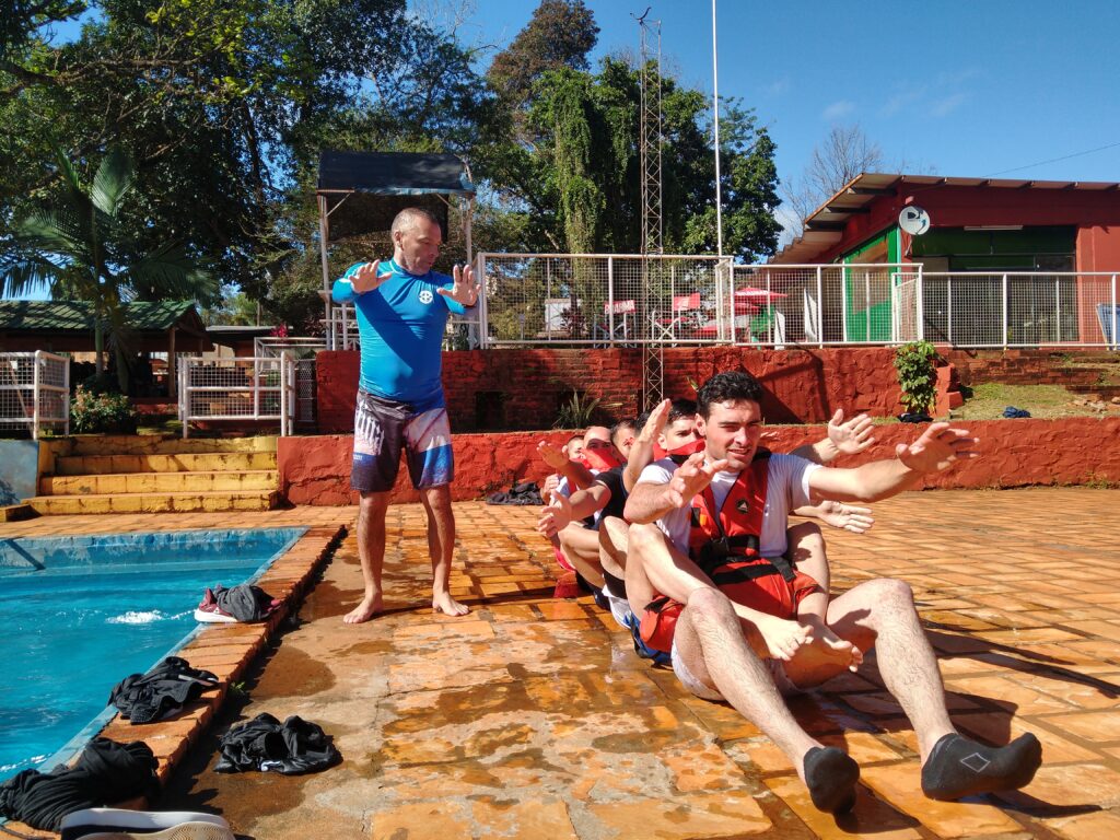 Son 55 efectivos de la fuerza, entre ellos Policía Federal Argentina, Ejército Argentino, Policía de la provincia de Misiones y efectivos de la Policía Federal de Brasil. La jornada de supervivencia y rescate en el agua estuvo a cargo del Instructor Sargento Primero Daniel Senicen quien explico paso a paso como sobrevivir en el agua, como utilizar prendas de vestir para hacer un chaleco salvavidas y como lograr en unidad sobrevivir en lugares inhóspitos.