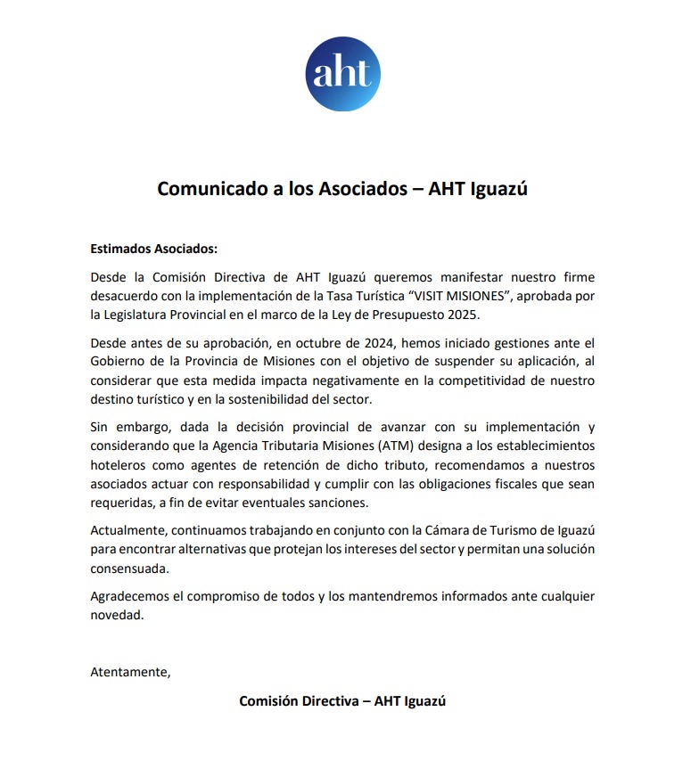 El escrito indica “Desde la Comisión Directiva de AHT Iguazú queremos manifestar nuestro firme desacuerdo con la implementación de la Tasa Turística «VISIT MISIONES», aprobada por la Legislatura Provincial en el marco de la Ley de Presupuesto 2025”